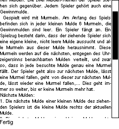 Murmeln dieser Mulde herausnimmt. Anschlie?end verteilt er die Murmeln auf die n?chsten Mulden entgegen des Urzeigersinns,